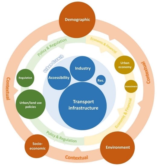 Additional factors were identified in the transport infrastructure sub-theme, which were also linked to physical-spatial change in urban areas. Wharfs, ferries, harbors, and ports characterized with special functions and coordinates can increase the speed of urban expansion in coastal cities [40,66,71,88]. Similarly, airports in convenient location contribute to the growth of urban and complementary transport infrastructure, and occasionally, when located near the core of a city can encourage substantial urban growth, that subsequently affects urban form and structure across a metropolitan area [1,8,13,24,25,40,57]. In the case of large-scale transport infrastructure projects, this can lead to the expansion of socio-economic factors such as GDP, industries, increasing investments in real estate, and the development of other complementary transport assets [27,30,71,81,94].