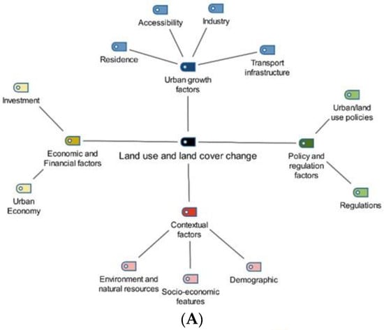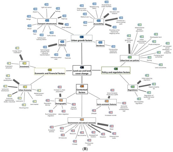Beyond theme synthesis and frequency computation, the results expanded on the relationships between driving elements. This helps in understanding inter-factor processes and side effects, which are highly interdependent. Using placement, level grouping, and arrows, the picture above reveals complicated links between analytical categories (i.e., themes and sub-themes). They may be studied in a three-level interaction on this basis. In the center, direct, place-based urban development initiatives (i.e., building transportation infrastructure, industries, housing, and services) create LULCC in urban areas. The second tier drives urban processes through the creation of policies, regulations, and financing of urban development projects, which is facilitated via various agents, entities and operational processes. Finally, the outer tier, contextual, is perceived as a set of effective factors (i.e., demographic, socio-economic, environment) through which the process of LULCC of an urban area is developed. In other words, these factors drive urban growth through decisions on urban policies and other operations (i.e., the second level or immediate inner circle in Figure 5). The theme and sub-themes, and factors (codes) are shown on Figure 6A (top), and B (bottom) respectively.