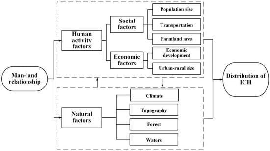 In this study, the administrative region (county and city) was set as a research unit. Data including the total amount and the number of each type of ICH were obtained from national- and provincial-level records. The distribution pattern of ICH was analyzed by spatial autocorrelation, hot spot clustering, and standard deviation ellipse analysis. The influence mechanism of man–land relationship indicators was analyzed through a geodetector model.