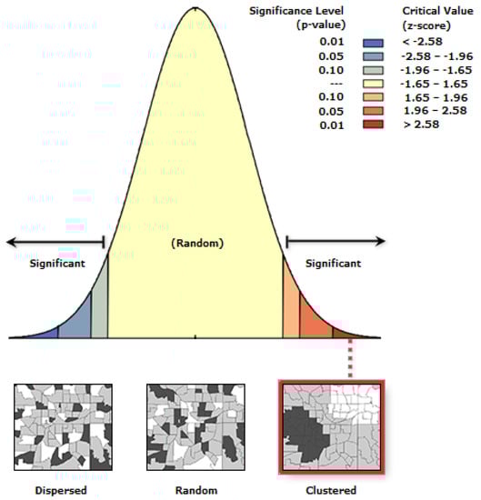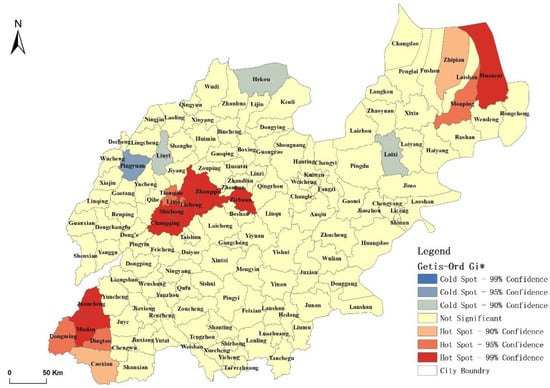 Getis-Ord was used to recognize the significantly high (hot spot) and low (cold spot) values in the ICH distribution in Shandong Province. the index could be used to recognize the local spatial autocorrelation feature []. The statistical meaning of was measured by the normalized value.