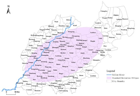 The results of SDE showed that: the distribution center of ICH in Shandong Province was located in the middle core group area, which almost covered the whole middle part of Shandong Province, including 90 districts (country and city). The azimuth angle was 61.09°, showing the distribution direction from southwest to northeast. The long axis of SDE ran along the Yellow River (Figure 5).