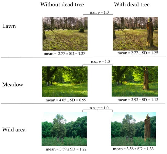 Average preference rating and standard deviation (SD) for differently managed cemetery spaces (lawn, meadow, wild area) without (left) and with (right) an inserted dead tree (n.s. = not significant).