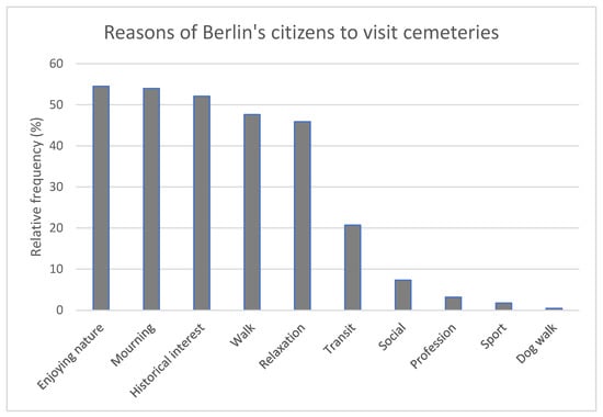 Relative frequency of the most common reasons of participants (n = 627) to visit cemeteries in Berlin. Due to possible multiple responses, 1875 answers were generated.