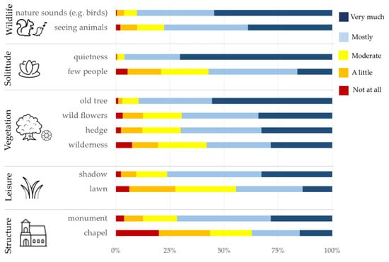 There were five overarching cemetery characteristics that were identified and differed in their relevance to the respondents (Figure 3 and Figure 4, Table A1). These five components which we address as overarching cemetery characteristics were named as ‘wildlife‘ (included two items: seeing animals and ‘nature‘ sounds such as bird sounds); ‘solitude‘ (two items: few people, quietness); ‘vegetation‘ (four items: old trees, wilderness, hedge, wild-flowers); ‘leisure‘ (two items: shadow; lawn); and ‘structure‘ (two items: monument, chapel) (Figure 3). Quietness, nature sounds (e.g., bird songs), and old trees most often received the most extreme rating ‘very much’ as important; in contrast to chapel which most often received the rating of ‘not at all’ important (Figure 3).