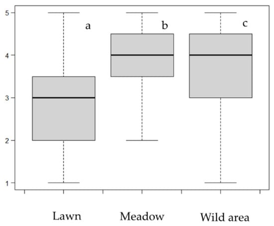 Preference ratings for lawn, meadow, and wild area with ratings of paired photo stimuli (with and without the dead tree) combined (n = 627). Different letters indicate significant differences at the p < 0.001 level. Scale of 1 (‘do not like at all’) to 5 (‘like very much’).