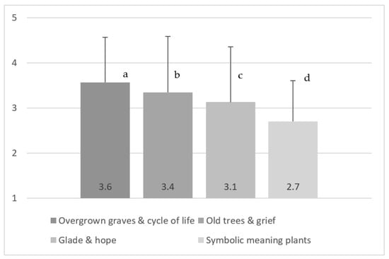 Comforting experiences of nature in cemeteries of the participants (n = 627). Different letters indicate significant differences at the p < 0.01 level (a, b and a, c) and at the p < 0.001 level (a, d and b, d).