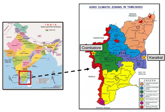 Location map of the study regions: Sadivayal, Coimbatore (western zone), and Karaikal (Cauvery Delta zone) in the Tamil Nadu state of India.