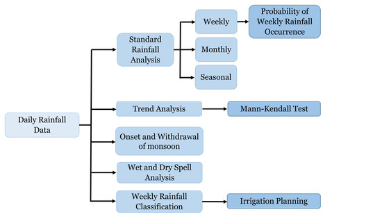 The following framework was adopted to evaluate rainfall contribution in rainfed and irrigated rice cultivation: (1) assessment of long-term rainfall variability in terms of annual, seasonal, monthly, and weekly time-scale; (2) investigation of rainfall trend; (3) determination of sowing and harvesting time based on the onset and withdrawal of monsoon; (4) identifying the frequency of dry- and wet-spell occurrence during monsoon; (5) finding the occurrence of assured rainfall magnitude at different probability levels using incomplete gamma distribution; and (6) estimating water availability and shortage at different growth stages of rice through rainfall classification analysis (Figure 2). Daily rainfall data were collected for both locations covering the period from 1951 to 2015.