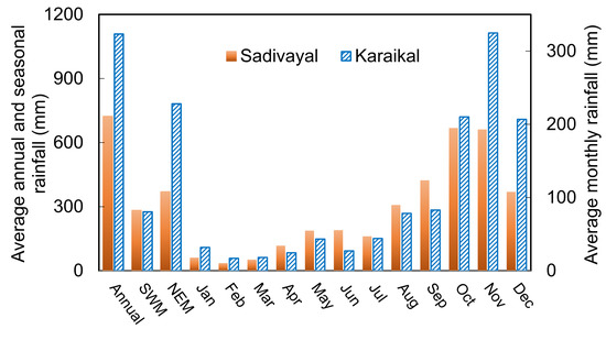 The standard rainfall analysis assessed the average rainfall distribution at four different time scales: annual, seasonal, monthly, and weekly. The comparison of mean annual, seasonal, and monthly rainfall for the period 1951 to 2015 is shown in Figure 3. Annual rainfall from 1951 to 2015 in Sadivayal varied in the range from a maximum of 2002.4 mm in 1971 to a minimum of 280.4 mm in 1974, with a mean of 721.9 mm and a coefficient of variation (CV) of 36%. On the other hand, the mean annual rainfall in the Karaikal region was 1108.5 mm in the same period. The Karaikal annual rainfall varied from 600 mm in 1980 to 1752.4 mm in 2004.