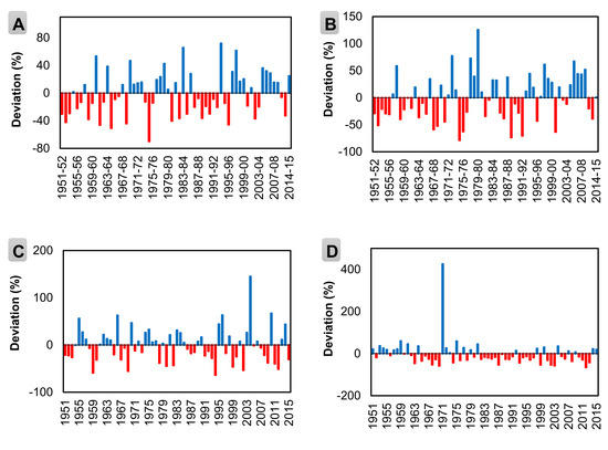 Seasonal rainfall deviation with the long-term mean of 65 years. (A) Late Thaladi Season (NEM) in Karaikal, (B) Thaladi Season (NEM) in Sadivayal, (C) Kuruvai Season (SWM) in Karaikal, and (D) Kar Season (SWM) in Sadivayal.