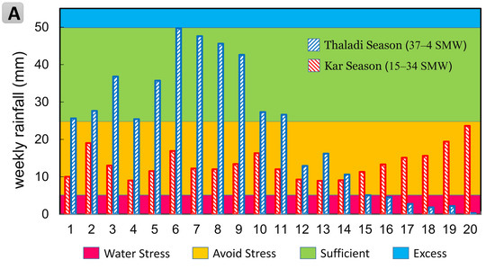 The incomplete gamma probability for weekly rainfall in the Sadivayal region indicates that the appropriate date for land preparation is 16th and 38th SMW due to receiving 25 mm rainfall with a probability of 25% in the Kar and Thaladi seasons, respectively. The assured minimum rainfall with a 50 percent probability during 41st and 42nd SMW is suggested as an ideal sowing period for the Thaladi and Late Thaladi rice-growing seasons [44]. Weekly rainfall classification analysis shows that water scarcity during the vegetative growth phase (from 26th to 29th SMW) can be addressed utilizing rainwater harvested from 24th and 25th SMW as life-saving irrigation for rainfed rice cultivated in the Sadivayal region. The results of the weekly rainfall classification of the earlier weeks in the Kar season show that the early sowing ensures all water-sensitive stages of rainfed rice with sufficient rainwater. However, early-sown rice suffers from water stress due to the minimal availability of weekly rainwater during the critical vegetative stage of rice growth (from 28th to 30th SMW) in the Kuruvai season.