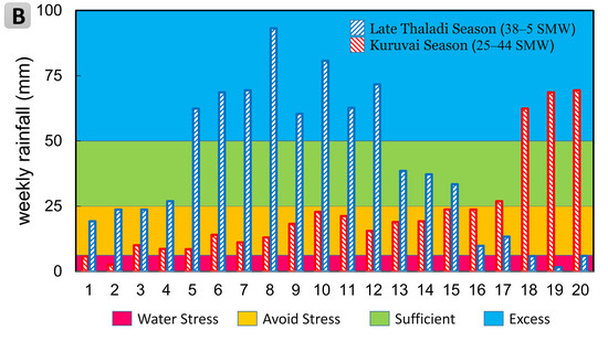 The vegetative phase (sowing to panicle initiation (PI)), reproductive phase (PI to flowering), and ripening phase (flowering to harvesting) are the three major growth stages analyzed in this study. Further, four categories of water availability were considered with the classification of weekly rainfall. Table 6 shows the distribution frequency of weekly rainfall, categorized into water stress, avoid stress, sufficient, and excess water availability in each rice growth stage. Water stress condition (weeks with less than 5 mm rainfall) is prevalent with a high frequency in most of the weeks of the Kar season. Moreover, from 26th to 28th SMW, sufficient water is rarely available when the rice crop is sensitive to water stress. Similarly, severe water stress occurs frequently during the first weeks of the Kuruvai season from 28th to 30th SMW (Table 6A,C). Despite the frequent water stresses observed during the weeks of the Kar and Kuruvai seasons, the number of events with sufficient rainwater is significant enough to be considered to meet the rice water demand. On the other hand, most of the weeks of the Thaladi and Late Thaladi seasons were reliable, with a high frequency of more than 50 mm water availability during 40 years. However, stressful conditions due to the water shortage are expected in the last weeks of the Thaladi and Late Thaladi seasons (Table 6B,D). The late sowing rice is exposed to definite water stress during its critical growth stages.