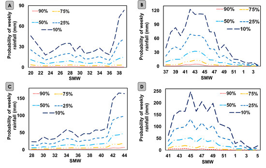Weekly assured rainfall at different probability levels. (A) Kar season (Sadivayal), (B) Thaladi season (Sadivayal), (C) Kuruvai season (Karaikal), and (D) Late Thaladi season (Karaikal).