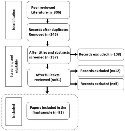 The search returned a total of 306 articles. A selection of 245 articles was found after duplicates were eliminated and they were ready for analysis. Since this review seeks to investigate only bottom-up governance approaches, traditional top-down, government-led arrangements were excluded from the final sample. In total, 108 articles were disqualified in the first round of screening (at the level of the title and abstract). The resulting sample’s titles, abstracts, and full text were assessed for relevancy considering only six types of small-scale UGI and new governance modes. Since this study addressed the link between ES and UGI, only articles focused on different types of ES through governance approaches were included. Articles with a rural or regional focus and large green infrastructures such as urban parks or vast vacant lands were excluded. Two runs of full-text screening were conducted; the first resulted in the exclusion of 12, and the second pass resulted in the exclusion of an additional 5.