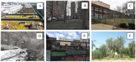 Diverse small-scale urban green infrastructure. (A) A small green roof on top of a residential building, USA. (B) A local public park, USA. (C) A privately owned piece of vacant land, USA. (D) Rain garden development, USA. (E) A community garden, USA. (F) Street trees, Iran. Photos taken by the authors.