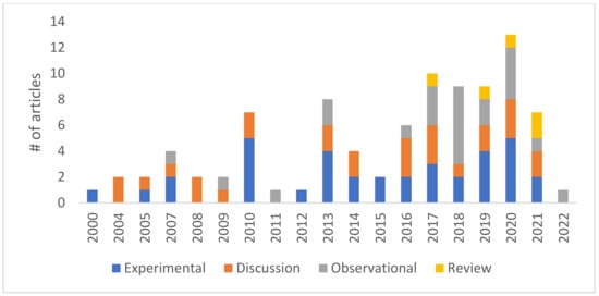 A systematic review of 91 articles indicated that the governance aspect of UGI is a growing topic of interest in academic research. The earliest articles were published in 2000 in the Journal of Health and Places about community gardening development and management. Based on their methods, the articles were divided into four groups: experimental, observational, discussion, and review (Figure 3). Discussion studies were primarily theoretical without data collection, whereas experimental studies involved intervention and primary data collection, observational studies used secondary data to analyze a phenomenon without intervention, and review studies conducted a systematic or scoping literature review. The most common study type was experimental (n = 36), followed by discussion (n = 27), observational (n = 23), and review (n = 5). In general, surveys, including interviews and questionnaires from stakeholders, were the most prevalent kind of experimental study. In addition, we found that community gardens and street trees were the most common types of UGI discussed in the reviewed articles. The specific characteristics of community gardens including but not limited to a socially inclusive, location in central parts of the neighborhoods, and a need to make fluidity between up-down and down-top management can lead them to be one of the most debatable themes in the UGI governance literature. Street trees were also amongst those UGIs that were largely reviewed thanks to their public nature, largely known benefits, and probably the fact that they are often apparently co-managed by both residents and municipalities. However, the adaptability and transformability of the governance modes of these elements in the face of societal and environmental changes (e.g., recent pandemic) can be further analyzed in different contexts to help policymakers to plan more mental and physical resilience for the future [119,120].