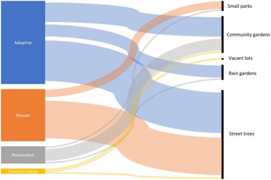This approach mainly focuses on the concepts of flexibility, connectivity, and learning in form of policies, formal mechanisms, and regulatory standards which are required to maintain small-scale UGI such as stormwater management systems or rain gardens. Flexibility in adaptive governance arrangement allows stakeholders to adapt their needs and expectations to new opportunities and drive UGI regulations and policies [115]. This approach presents many opportunities for leveraging local UGI to support ES. For instance, converting vacant land into stormwater management systems requires flexible and responsible management structure tools, such as land banks to help municipalities identify suitable vacant parcels [123]. Without the flexibility of AG, it would be time-consuming and difficult for municipal agencies to respond to social and environmental disturbances [27].