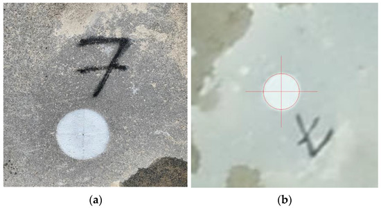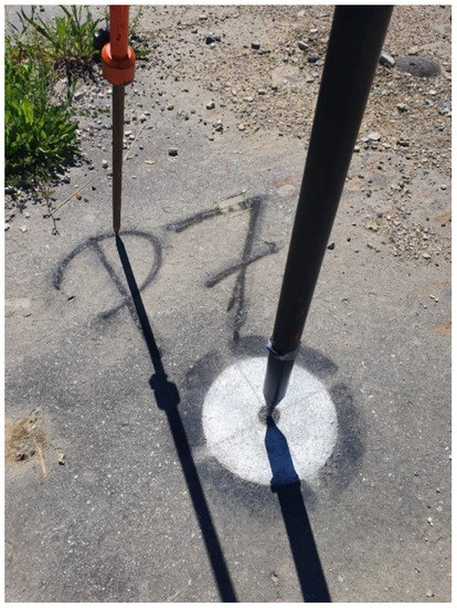 To investigate the possibility of using unmanned aircraft for the purpose of geodetic surveying, a research site in the city of Samobor was established. The research site consisted of 7 GCPs and 19 CPs, in the part of cadastral parcel no. 2690/16 in the cadastral municipality Samobor, as shown in Figure 1. GCPs and CPs were drawn using a previously made point model and painted with white spray on the asphalt surface as circles with a diameter of 20 cm, and a black border was added to the GCPs as shown in Figure 2. The study site was first measured by the classical method of geodetic surveying, the polar method, using a total station. Leica TCRP1201 robotic total station was used, which has a standard deviation of the accuracy of determining angles of 1” according to ISO standard 17123-3 and the accuracy of determining distances of 2 mm + 2 ppm according to ISO standard 17123-4 [22]. After that, all points, GCPs and CPs, were measured by the GNSS RTK method using a Topcon HiPer SR receiver, which in RTK measurement mode has a horizontal accuracy of 10 mm + 1.0 ppm, and a vertical accuracy of 15 mm + 1.0 ppm [23]. GCPs were measured in two independent repetitions, where each repetition had three consecutive measurements, and each measurement epoch had a duration of 30 s. In accordance with the Ordinance on the method of performing basic geodetic work [24], all GCPs were measured again in the same way after two hours. CPs were measured once in a way that each measurement had a duration of six seconds. The GNSS RTK method was used to determine the coordinates of all points in the official map projection HTRS96/TM, and the polar method to increase the positional “strength” of points in all directions, i.e., to increase the relative accuracy between them. By adjusting all the measurements from both, the polar method and GNSS RTK survey, the coordinates of the measured points collected by classical methods were obtained. Those coordinates were taken as error-free in the a posteriori performed analysis due to relatively low theoretical deviations from the theoretical deviations obtained by the aerial photogrammetry method. CPs were used to assess the absolute accuracy of the models. With CPs, it is possible to obtain the difference between the reconstructed model and the actual position of points.