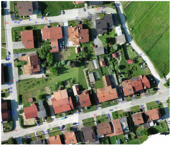 A UAS photogrammetry survey of the study area was performed using DJI Phantom 4 Pro V2.0 at a flight height of 60 m, using the same flight settings as in the first study site in terms of the overlap and camera angle. The results using Phantom 4 Pro V2.0 with GCPs at the same height were also shown in the work [27], where the correlation between flight height and obtained accuracy was also determined. Furthermore, the obtained accuracy satisfies the cadastral requirements of the Republic of Croatia regulations, i.e., the requirements set in Article 52 of the Ordinance on geodetic studies [17]. Therefore, Phantom 4 Pro V2.0 was used for the aerial photogrammetry survey at the second study site. The absolute orientation of the model was carried out using GCPs and a DOF map was constructed. Georeferencing of the model was carried out using GCPs because the results from the first study site showed that the absolute accuracy using GCPs is more accurate than using an RTK sensor. The coordinates of all 48 measured fence points were also obtained from the DOF map. In Figure 4, the fence points are marked with blue and the GCPs with red colour.