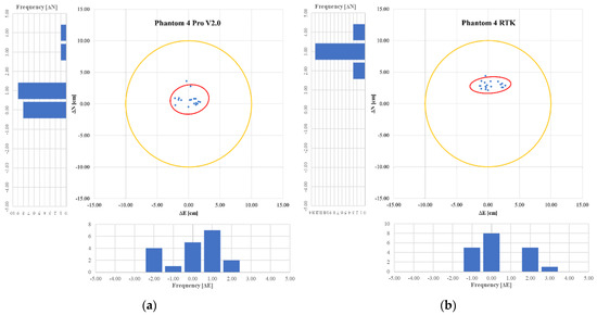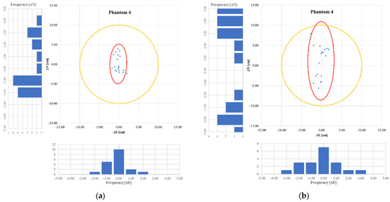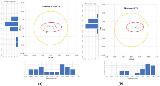 Figure 8. Confidence ellipse—Phantom 4 Pro V2.0 with GCPs at 120 m (a); Confidence ellipse—Phantom 4 RTK without GCPs (RTK) at 120 m (b).