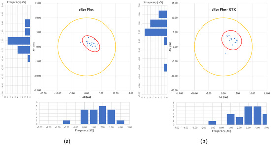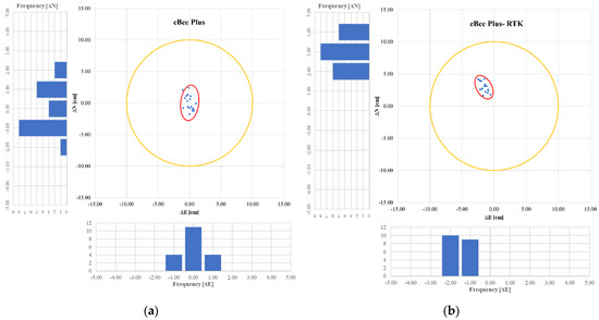 Figure 9. Confidence ellipse—eBee with GCPs at 60 m (a); Confidence ellipse—eBee without GCPs (RTK) at 60 m (b).