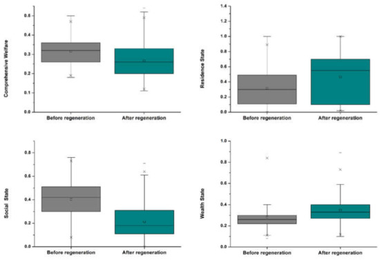 According to Amartya Sen’s theory, the same resources can be converted into different functional activities by different people in different environments. The living conditions of the residents in the centralized resettlement were affected by the variables related to the regeneration behavior. At the same time, such changes have a certain difference due to external factors and individual characteristics. When these factors lead to differences in residents’ living conditions, they also cause instability at the state layer in the sustainable regeneration model. Therefore, this study will explore the factors causing the differences. As for external factors, due to the fixed location of spatial production factors, there are differences in the accessibility and use of production factors for resettled residents in different location conditions, which is an important part of welfare transformation. Therefore, the differences in location conditions were selected for analysis. Figure 3 reveals the dispersion of the samples before and after the regeneration. In the figure, the interquartile range has increased after the regeneration, and the interquartile range has increased slightly at the level of comprehensive welfare, indicating that the dispersion degree of data has increased and the degree of individual differentiation of comprehensive welfare of resettled residents has increased. From the perspective of the dimensions of residence and wealth, the interquartile range increased significantly, indicating that the two dimensions present a great degree of differentiation, while the social dimension presents a small degree of differentiation. According to the evaluation results, health and work dimensions are not significantly affected by the regeneration behavior of local resettlement, which is not considered in this chapter.