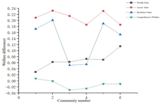 Generally speaking, the housing value is determined by the housing quality and location factors. As the six communities all belong to resettlement communities in nature, the differences in housing value mostly lie in the differences in location conditions. The average housing price of each community was collected on the second-hand trading platform, and the average housing price of the six resettlement communities from low to high is as follows: 1.F, 2.B, 3.D, 4.E, 5.A, 6.C. The state change values of wealth state, social state, residence state, and comprehensive welfare of each settlement community (the welfare state value after regeneration minus the welfare state value before regeneration) were presented in the form of a linear graph.