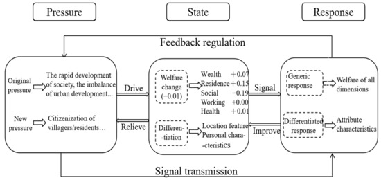 The state layer of the sustainable regeneration PSR model refers to the state reflected by the systemic impact of the resettled residents in terms of production and life. When the impact is positive, the regeneration is considered sustainable, and vice versa. The response layer of the regeneration system refers to the social behaviors possibly produced by rights holders and their corresponding management decisions when there is deviation between the pressure layer, the state layer, and the sustainable development. When the two layers are highly matched, the regeneration is considered to be sustainable, and vice versa. According to the analysis results of the state layer, although the residence state has been significantly improved, the overall state change is not obvious, and from the perspective of various dimensions, the negative impact of social state is more serious, and the individual differences in the state layer have not been taken into account, which means that the regeneration is not sustainable at present. Based on the results of empirical analysis and the PSR model of sustainable regeneration from the perspective of multidimensional welfare, this paper will expand the elements involved in the model to analyze both each part of sustainable regeneration in Xi’an and the deficiencies affecting the sustainability in the system. The process analysis model is shown in Figure 5.