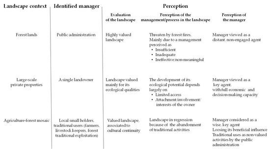 From the analysis of the participants’ responses, three relevant contextual situations emerged that were related to three different types of landscapes linked to specific managers and to particular processes with a prevailing impact on the landscape and its perception. These categories are summarized as follows:
