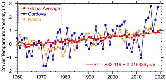 Annual average 2 m air temperature anomaly (°C) for the globe (red), Cordova Alaska (blue) and Palma de Mallorca Spain (orange) over the 1960–2020 period. The global temperature anomaly trend (red line) is 0.16 °C per decade. The global data are provided by NOAA [21] and the Cordova and Palma de Mallorca data are from the nearest grid point from the ERA5 reanalysis [22].
