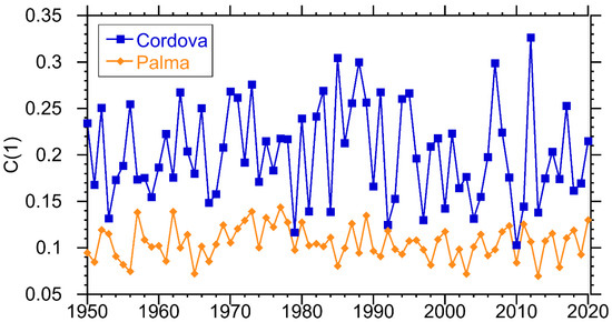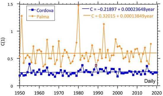 Intermittency parameter for the wind in Palma de Mallorca and Cordova for daily data. The intermittency parameter is unitless.
