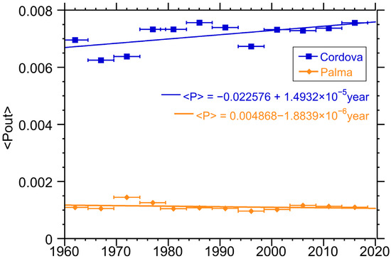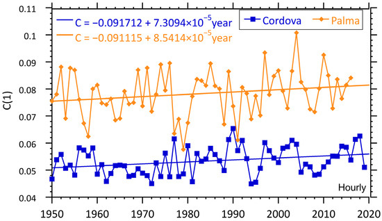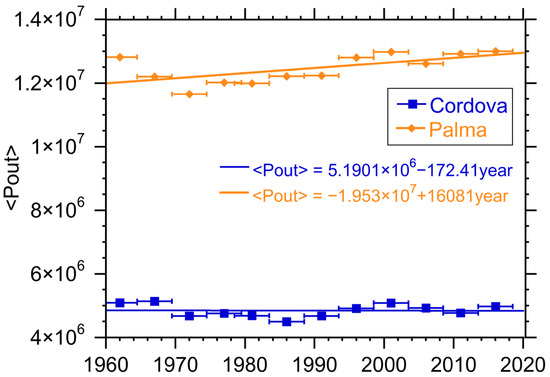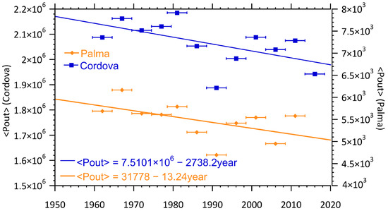 At both locations, we can see a consistent increase in the yearly averaged temperature. Moreover, in both cases the increase is similar to or slightly larger than the increase in the averaged global temperature. The slope of the global temperature data is ~0.016 °C/year while the Palma de Mallorca data show ~0.020 °C/year and Cordova with ~0.029 °C/year. This suggests that it should be possible to detect the impact of this warming on the local renewable sources. It is also worth noting that the rate of change is larger in Cordova than it is in Palma de Mallorca, consistent with the notion of polar amplification [30].