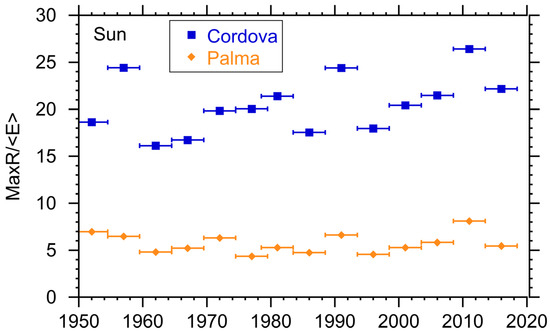 Ratio of the energy storage needed to the average daily energy produced by solar plants in Cordova and Palma de Mallorca. MaxR/<E> is unitless. Horizontal bars indicate interval over which the parameter was calculated.