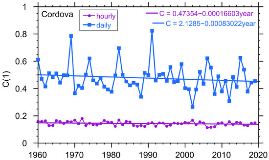 Intermittency parameter for the precipitation in Cordova for hourly and daily data. The intermittency parameter is unitless.