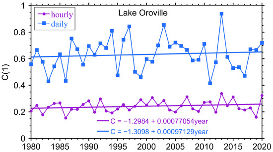To confirm these analyses in a location where climate change effects on precipitation are already being documented [33] we have done an analysis of the intermittency in a location in northern California, Lake Oroville, where we know the impact has been clear. In Figure 8, we show the intermittency parameter as a function of time calculated using ERA5 data for Lake Oroville.