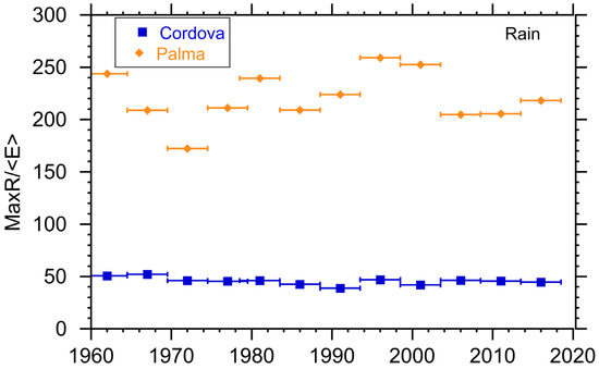 Ratio of the energy storage needed to the average daily energy produced by hydro plants in Cordova and Palma de Mallorca. MaxR/E is unitless. Horizontal bars indicate interval over which the parameter was calculated.
