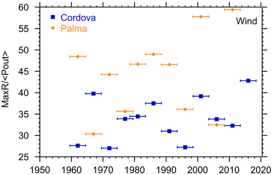 Ratio of the energy storage needed to the average daily energy produced by wind plants in Cordova and Palma de Mallorca. MaxR/E is unitless. Horizontal bars indicate interval over which the parameter was calculated.
