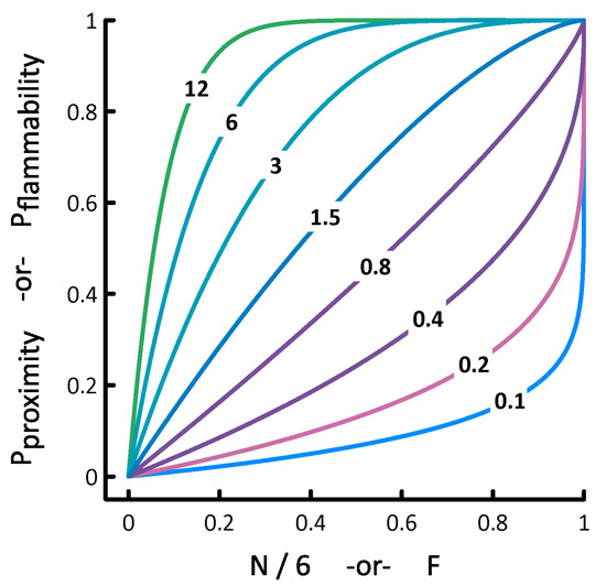 Shapes of the probability curves derived from specific values of N (neighbors on fire) or F (relative flammability), and α or β (the proximity and flammability exponents). Exponent values are superimposed on the curves they produce.