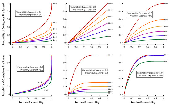 Six examples of how the probability of contagious fire spread changes as a function of a cell’s relative flammability, and its number of burning neighbors (N).