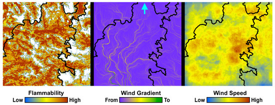 Example 2 spatial inputs, including relative flammability (left), wind gradient (center) and relative wind speed (right). The emergent simulated burn perimeter (see Results) is shown as a black outline. The arrow at the top-center indicates the location at which the fire was initiated.