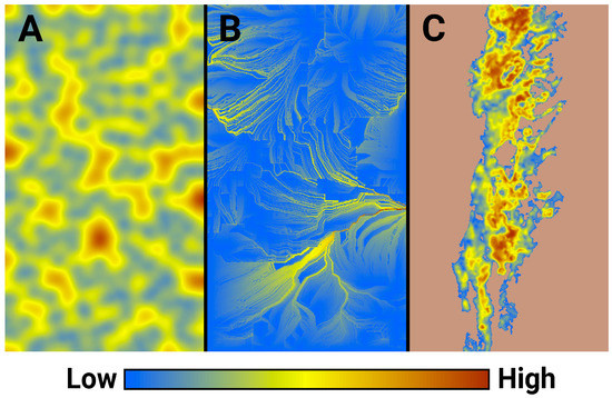 Example 3 spatial inputs, including (A) relative flammability, (B) wind gradient, and (C) marten habitat quality.