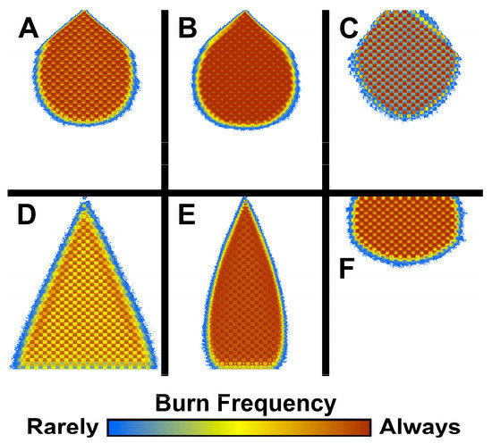Relative to the baseline parameters, the overall mean burn frequency increased when the Flammability Exponent was increased and the Proximity Exponent decreased (experiment B). The mean burn frequency decreased when these parameter modifications were inverted (experiment C). Not surprisingly, the mean fire footprint expanded significantly when embers were allowed to travel further (experiment D). Likewise, the fire footprint narrowed when embers were made to more closely track the wind direction (experiment E) and widened when embers traveled more randomly (experiment F).