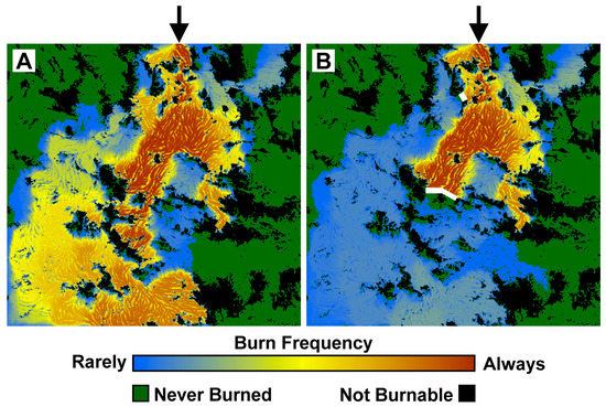 Mean burn frequencies (A) without and (B) including fuel breaks. Fuel breaks, shown in white, indicate areas where the fuel flammability was set to zero. Black arrows show the location at which the fires were initiated. These results were assembled from 100 replicate simulations.