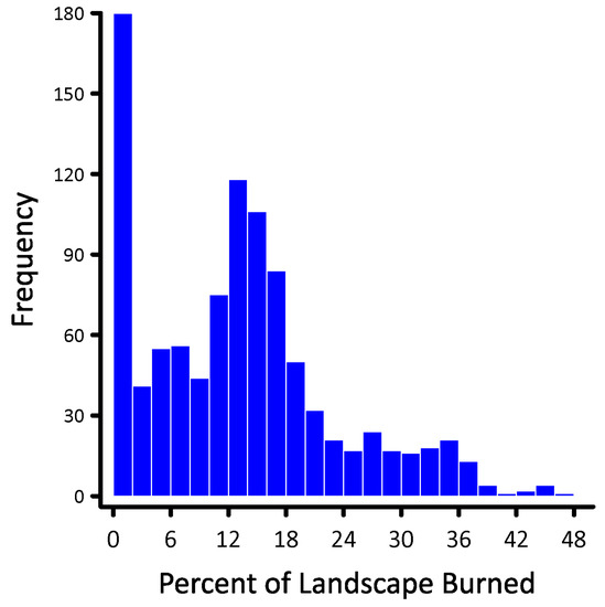 As described in the Methods, we used HexFire to generate a collection of 1000 fire outcomes, each corresponding to a single simulated wildfire season. The resultant distribution of observed fire sizes was dominated by small burns but exhibited a large number of intermediate-sized disturbances as well (Figure 7). The largest of our simulated burns consumed just under 47% of the entire landscape. These wildfires were unequally distributed across the study landscape, and the most frequently burned areas fell outside the marten’s range (Figure 8).