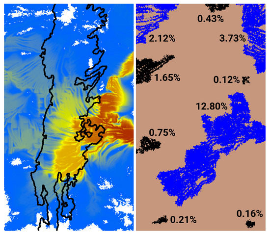 Mean burn frequency generated from 1000 fire simulations (left), and nine illustrative non-overlapping fires selected from this collection (right). Mean burn frequency is displayed using the color ramp of Figure 4, and the black outline indicates the extent of marten habitat. Burn sizes indicate the proportion of the landscape consumed by a single fire. The color assigned to individual fires (black vs. blue) has no significance.