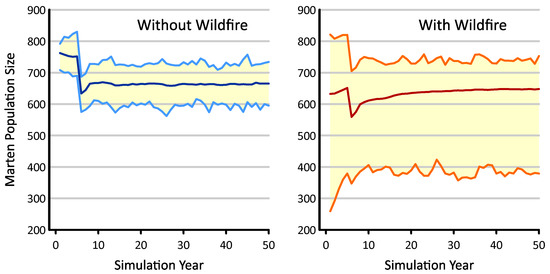In the absence of wildfire, the simulated marten population reached steady-state by year 10 (Figure 9), with a consistent mean of ~663 individuals ±15% (min = 562; max = 757). When impacted by wildfire, the mean population size never fully stabilized, but grew to 648 martens by the end of the 50-year time period. Relative to its undisturbed analog, the variability in population size increased dramatically when the martens were subjected to fire. This resulted from reductions in the minimum population size, which when averaged over years 10–50, dropped to just 385 martens. In these worse-case examples, wildfire ended up lowering the simulated marten population by up to 42%.