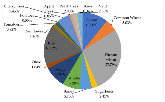According to this data, durum wheat cultivation accounts for the largest percentage, or 27.79%. This is followed by rice and cotton crops, which have respective percentages of 16.72% and 10.80%. The cultivation of maize contributes to the crop plan by 8.97% and alfalfa by 7.29%. Cherry (5.45%), barley (5.15%) and common wheat (5.03%) crops have similar participation rates. Sugar beet (2.45%), vetch (2.33%), peach (2.05%), olive (1.84%) and sunflower (1.46%) crops follow with a smaller contribution. Tomatoes (0.92%), apple (0.85%), potatoes (0.55%) and kiwis (0.34%) crops contribute with a percentage of less than 1%.