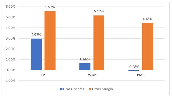 Figure 3 presents the percentage changes in the economic indicators (gross income and gross margin) after the application of the three mathematical models. Thus, there is an increase of 2.97% in the gross income in LP, but also a 0.66% increase in WGP, while the gross income decreases by −0.08% in PMP. Regarding the second economic indicator, in LP there is an increase of 5.57% while in WGP increases by 5.17% and in PMP model it increases by 4.45%.