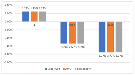 The percentage changes for the three social indicators (labor use, annual work units, and seasonality) are shown in Figure 4 below. There is an increase in labor use by 1.23%, in LP, while in WGP and in PMP it decreases by 2.69% and 3.77%, respectively. Annual work units showed an increase of 1.23% in LP, while in WGP and PMP it shows a decrease of 2.69% and 3.77%, respectively. Finally, seasonality increased in LP by 1.23% while it decreased by 2.69% in WGP and by 3.77% in the PMP model.