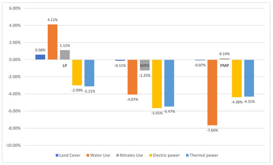 Finally, Figure 5 presents the percentage changes of the five environmental indicators, (land cover, water use, nitrate use, electric, and thermal power) after the application of the three mathematical models. The sixth environmental indicator (crop diversity) is not shown, since it is a number. In detail, the land cover shows an increase in the LP model at a rate of 0.58%, when it decreases in the WGP and PMP models by 0.11% and 0.07%, respectively. In water use, there is an increase in LP and a decrease in WGP and PMP models. However, an increase is also observed in the use of nitrates in the LP and PMP models, while a decrease is observed in the WGP model. The electric power is reduced during the implementation of the three mathematical programming models. A decrease is also observed in the thermal energy in all three models.